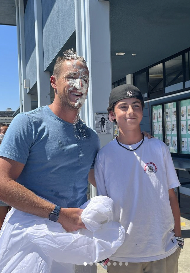 McAuliffe Middle School Principal Ryan Weiss-Wright, Ed.D., poses with a student after getting a pie in the face, the reward for a campus fundraiser going on now. Photo from McAuliffe Instagram account.
