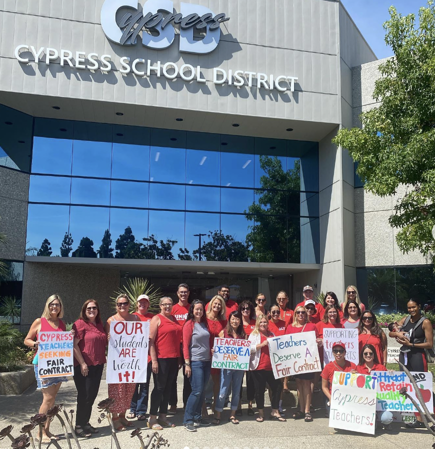 Cypress teachers rally before their first mediation meeting with the school district over contract negotiations in July. Photo courtesy of ACT Instagram account.