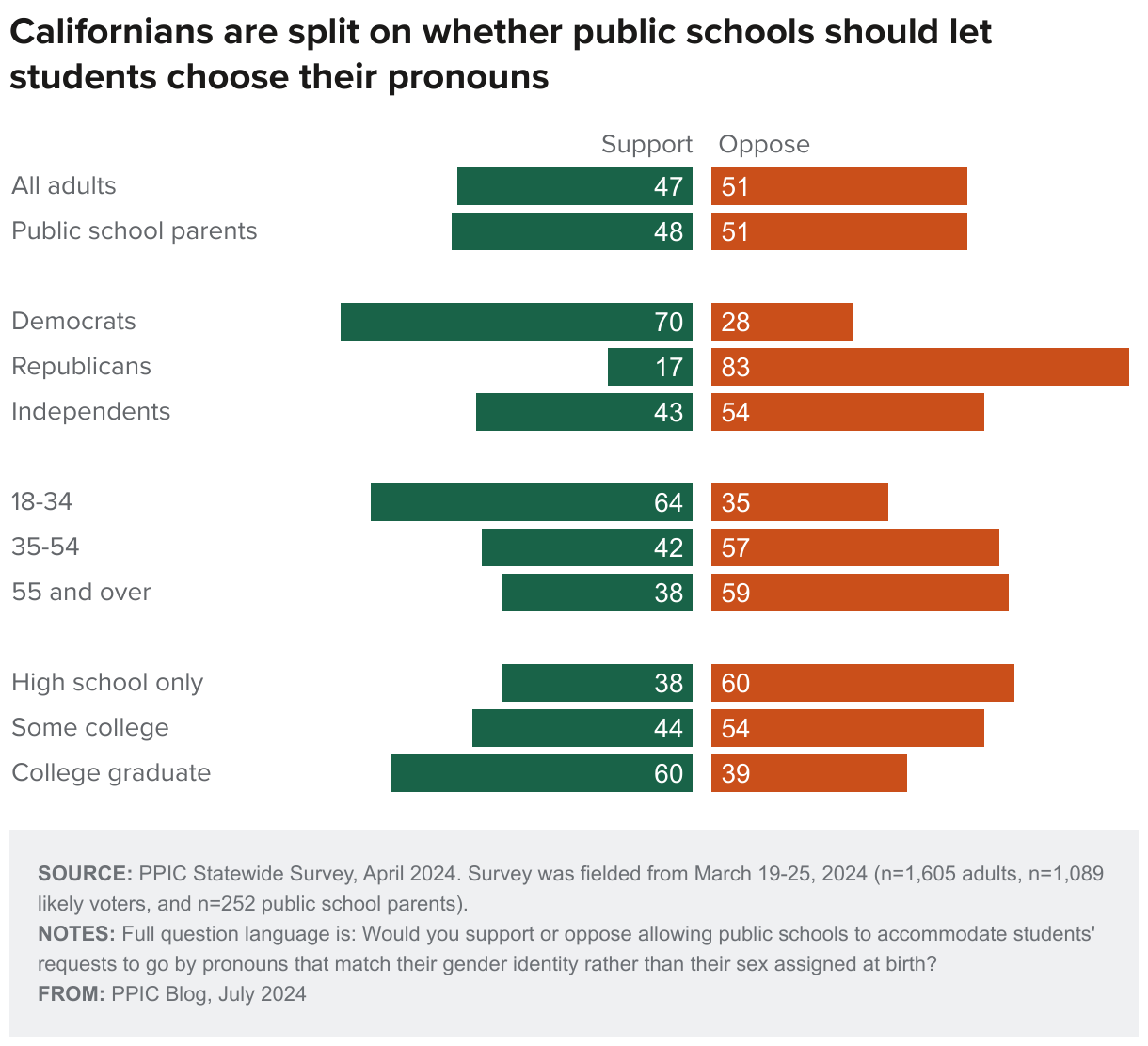 There is also a clear split along party lines. According to the PPIC survey, 83% of Republicans polled were opposed to letting public school students choose their pronouns, while 70% of Democrats were supportive of it.