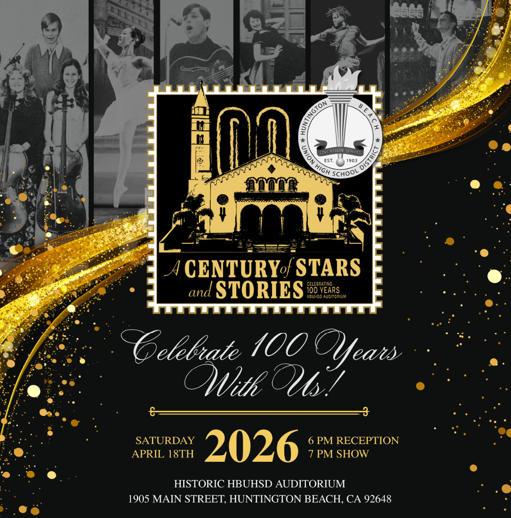 To celebrate the milestone of the historic Huntington Beach Union High School District (HBUHSD) Auditorium turning 100 years old in 2026, and to commemorate 10 decades of shows and performers, HBUHSD is set to host the show “A Century of Stars and Stories” on April 18, 2026 at 7:00pm, with a welcome reception beginning at 6:00pm.