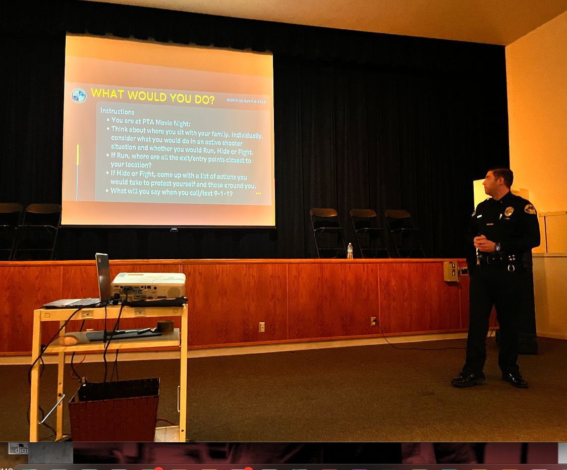 The presentation was given by SBPD Lt. Nick Nicholas and held at J.H. McGaugh Elementary School Auditorium on Dec. 8. It was co-hosted by McGaugh PTA partly in response to a recent incident when a man was arrested after he jumped a fence onto campus during a PTA-sponsored movie night leaving some parents rattled and wondering how to react.