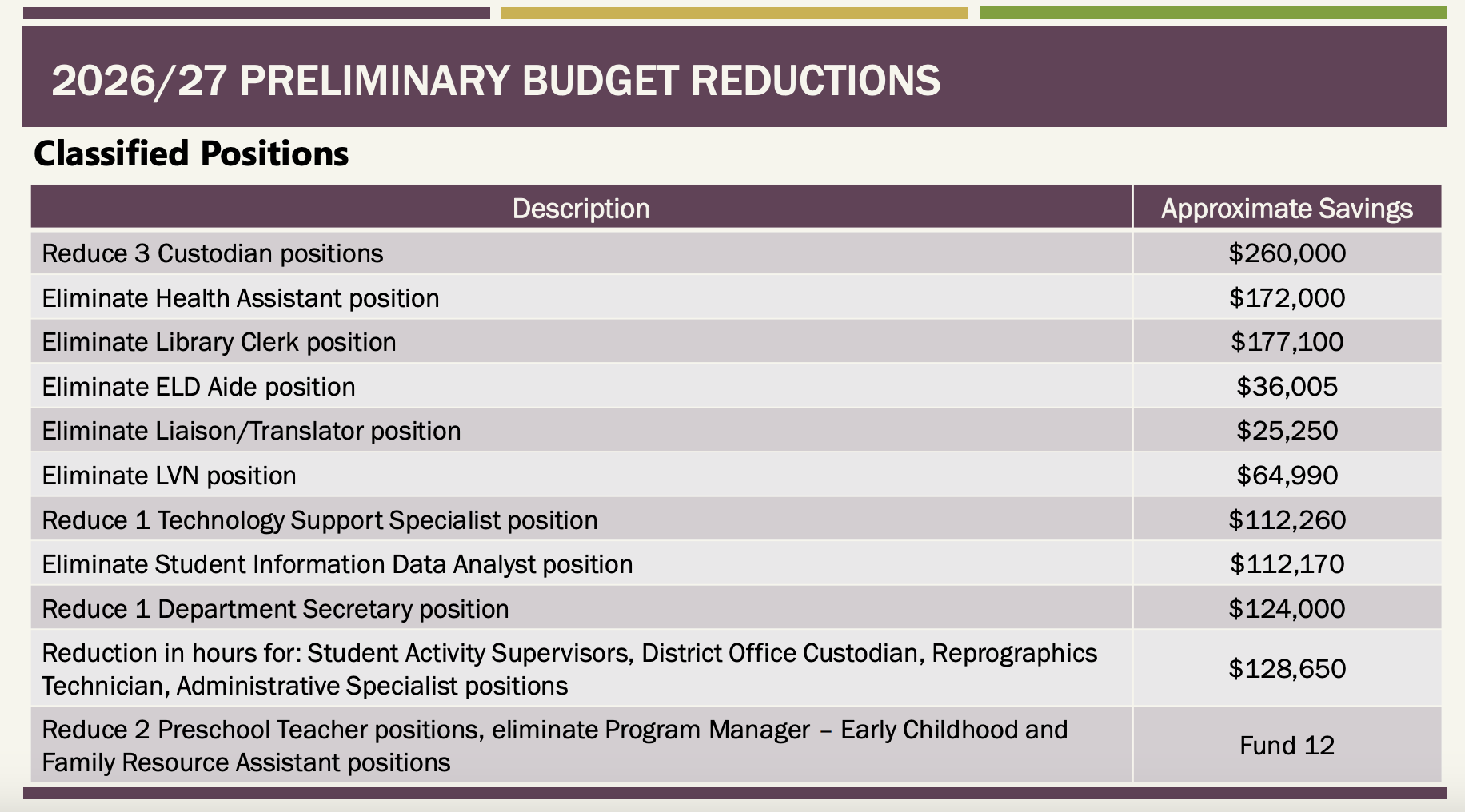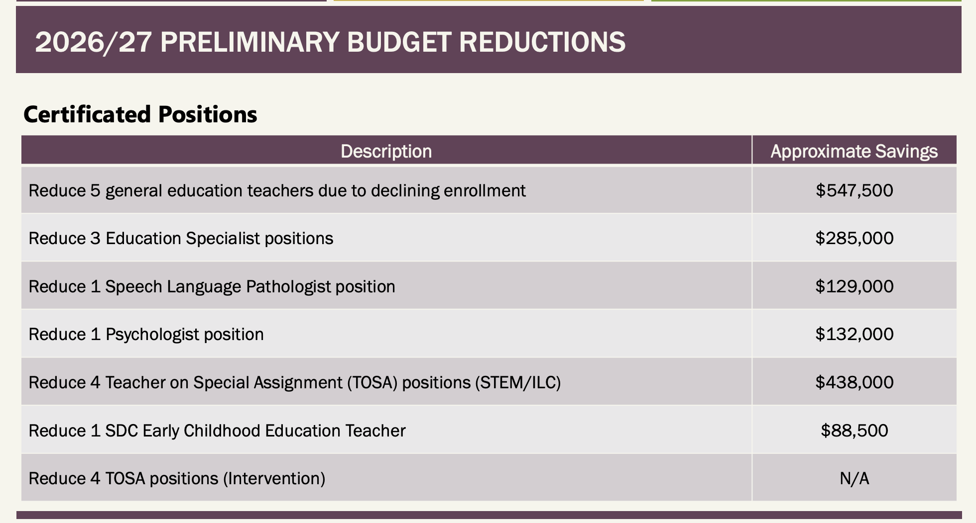 The district said about 83% of its budget goes toward staff salaries and benefits so most of the cuts will come from eliminating positions. According to the proposal (see images below), the district is considering cutting 19 certificated positions, including several teaching jobs, for estimated savings of more than $1.6 million. The district is also proposing eliminating more than a dozen classified positions to free up more than $1.2 million.