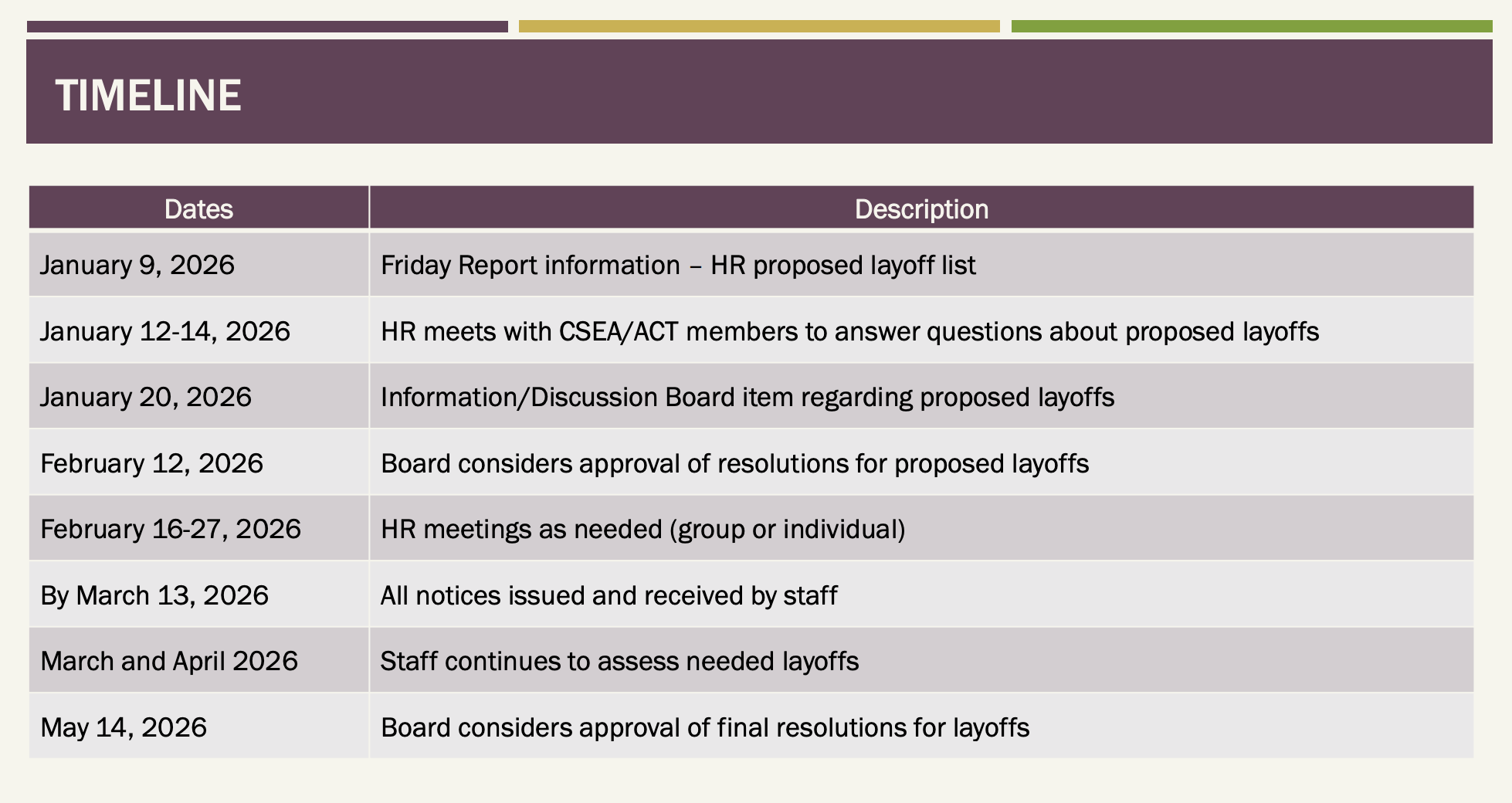 State law requires the district to formally issue preliminary layoff notices to affected employees by March 15. The district anticipates action on the budget reduction plan at the February 12 meeting of the board but states that, "if more funding becomes available or costs decrease, some layoff notices may be rescinded."