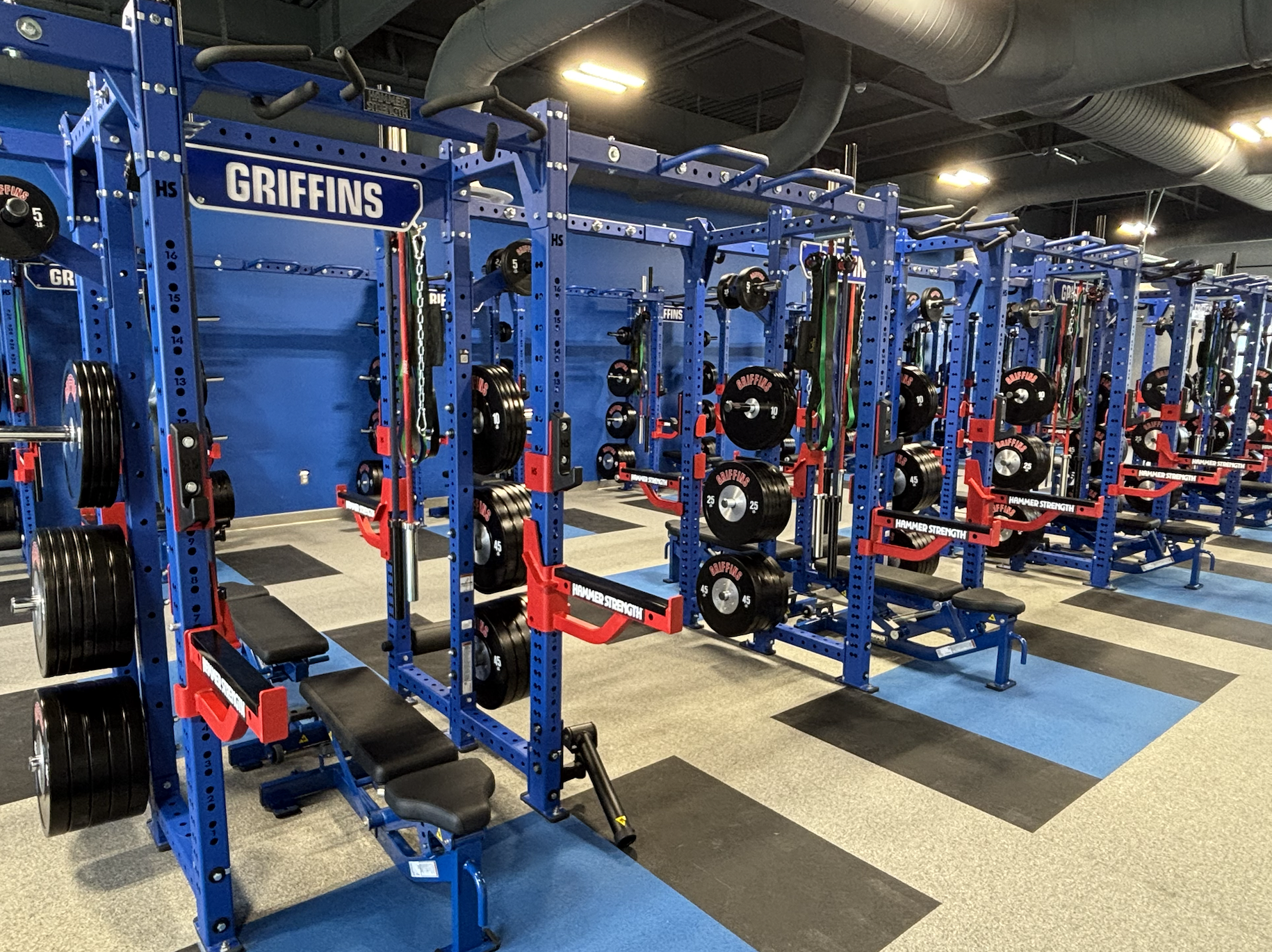 The Griffin Center features a three-court gymnasium with 2,000-seat retractable bleachers, four team rooms, a dedicated weight training suite with dual outdoor plyometric zones, dual concession stands, and strategically placed restrooms serving both court and field use. It also houses a glass-enclosed lobby with a curated Hall of Champions celebrating Griffin athletic achievements, along with AV technology and a track-and-field video display board that elevates the game-day experience.