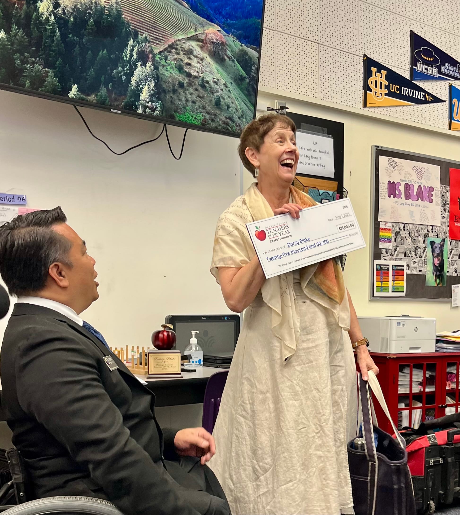 It was almost lunch time at Ladera Vista Junior High School of the Arts in the Fullerton School District when the OCDE’s prize patrol showed up at English teacher Darcy Blake’s classroom full of students.
