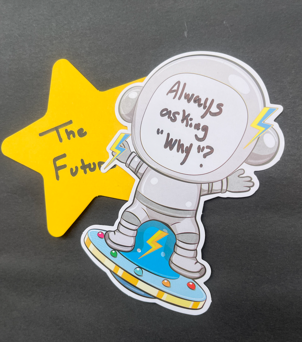 During lunch, dozens of sixth graders crowded around the legacy wall, scooping up the paper cutouts of astronauts and stars to write their responses. “Curiosity means to me everything that I want to learn,” read one. “Be bold. Never give up,” wrote another student. “Not to be afraid of exploring,” wrote a third.