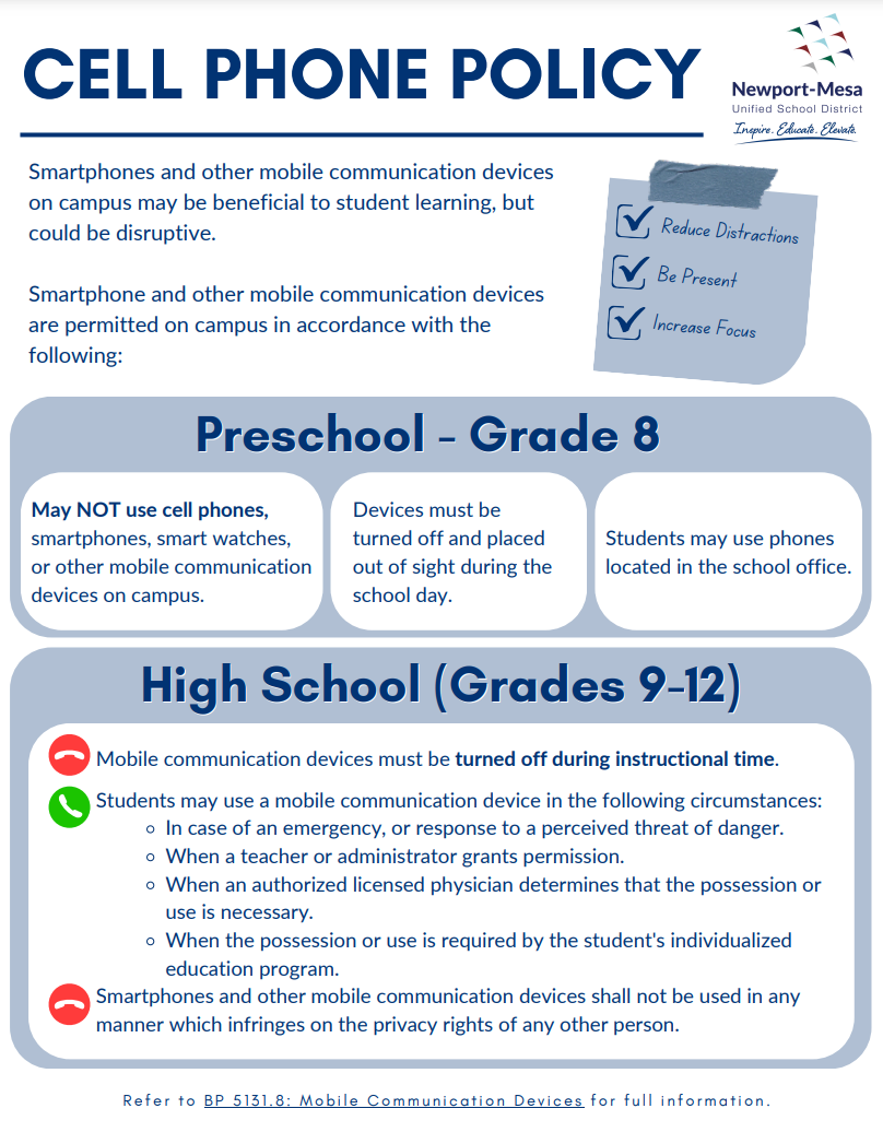 Last October, The Newport-Mesa Unified School District updated its board policy to “create a more conducive learning environment that promotes academic focus and engagement and encourages positive social interactions among students.”
