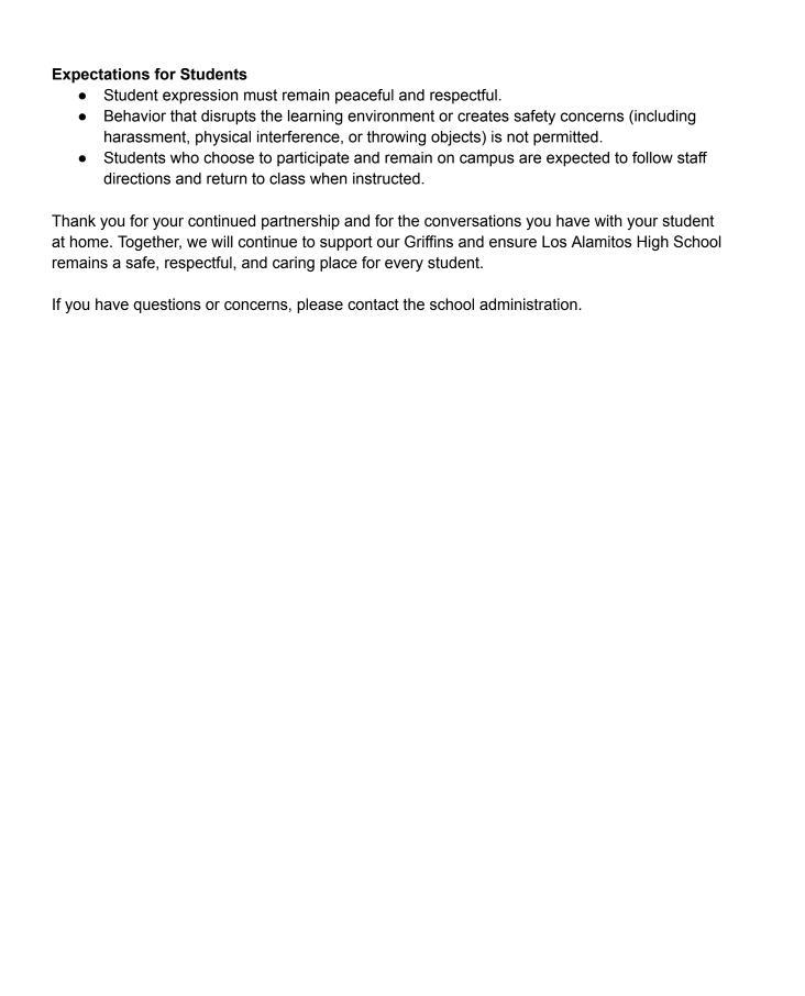 “As a public school, we respect students’ rights to peacefully express their views. At the same time, our responsibility is to maintain a safe, orderly learning environment and ensure appropriate supervision for all students,” LAHS Principal Christiana Kraus wrote in a letter sent to families on Feb. 10. She strongly encouraged students to stay on campus and said that a designated area at school would be available for students who wanted to gather and express themselves peacefully.