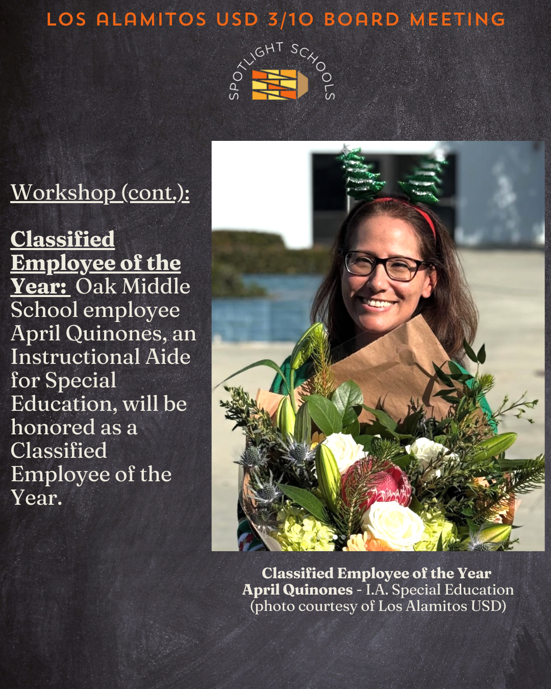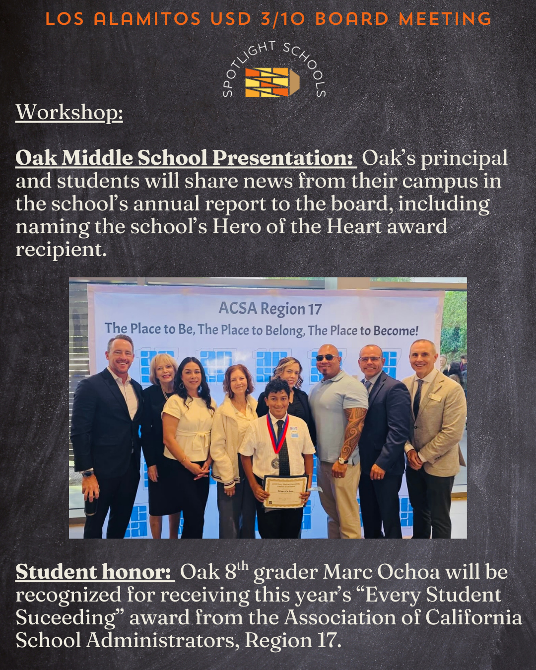 Oak Middle School’s principal and students will deliver the school’s annual report to the board. Oak 8th grader Marc Ochoa will be recognized as the recipient as the Every Student Succeeding award from the Association of California School Administrators, Region 17. The honor is given to students “for overcoming the odds and achieving success,” according to ACSA. Oak Instructional Aide April Quinones will also be honored as a Classified Employee of the Year.