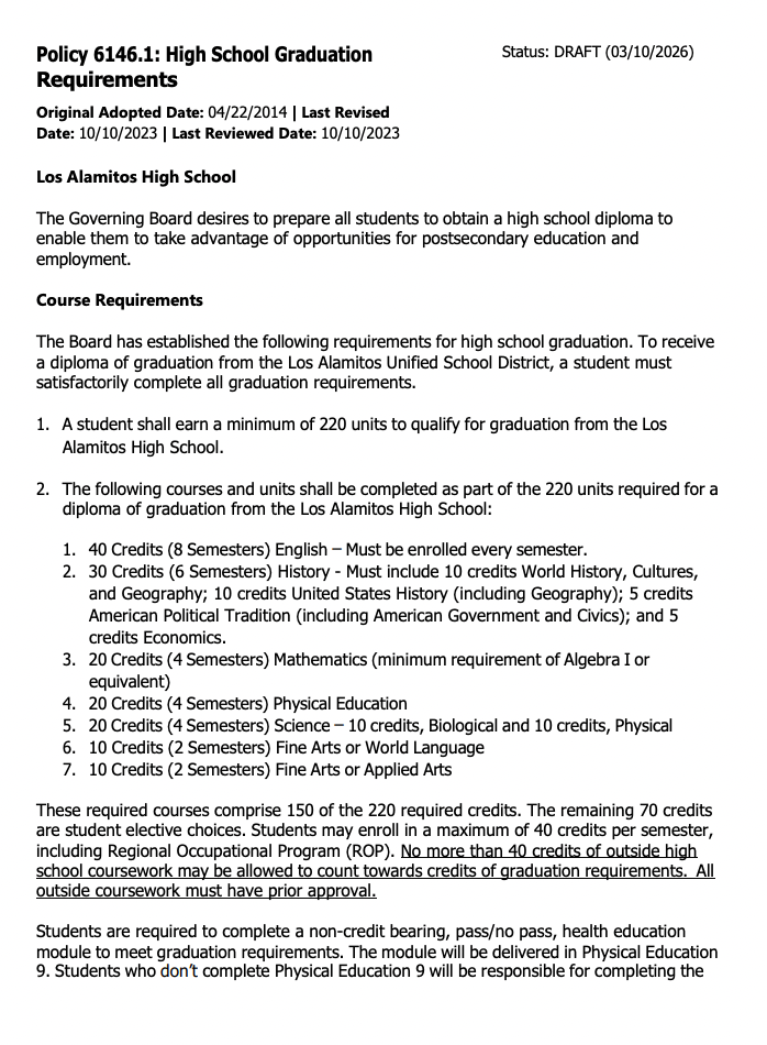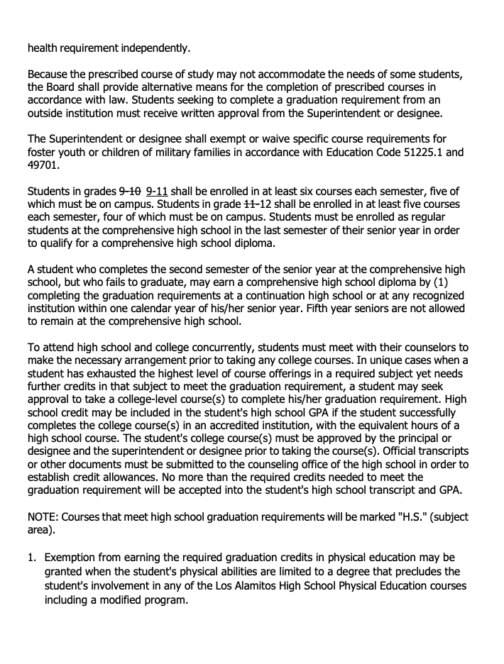 👨🎓 ITEM 11.a REVISING GRADUATION REQUIREMENTS: The board will have a first reading of revisions to its policy on high school graduation requirements. According to the agenda, the action is meant to: “Clearly define units allowed of outside high school coursework towards graduation credits and expand the school day of eleventh grade students.” According to the revised policy, students must earn a minimum of 220 units to graduate from LAHS. Requirements account for 150 of the units and the remaining 70 units are student elective choices. The policy now states “No more than 40 credits of outside high school coursework may be allowed to count towards credits of graduation requirements. All outside coursework must have prior approval.”