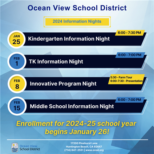 Enrollment for the 2024-25 school year in the Ocean View School District opens January 26. It has 14 campuses serving TK-8th grade students in Huntington Beach, Westminster, and Midway City. The district is promoting a series of Parent Information Nights in the coming weeks with the marketing tagline: “Come Fall in Love with OVSD.”