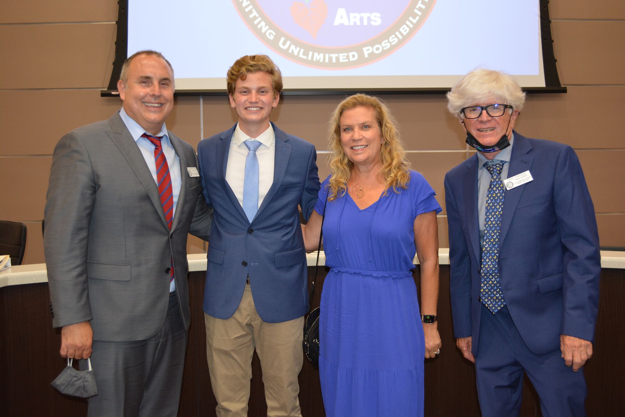 From left to right: Los Alamitos USD Supt. Andrew Pulver, Student Board Representative Will Brandenberger, Will's mother Amy Brandenberger and board member Chris Forehan at the August 17, 2021 board of education meeting. Tonight Will is scheduled to deliver his final report as student board representative. Courtesy photo.