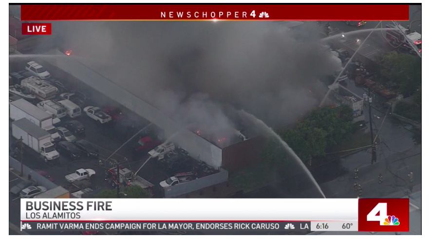 An NBCLA report showed the fire at a commercial building that erupted near Los Alamitos Elementary and McAuliffe Middle School around 6:00 a.m. Tuesday morning. Screenshot from NBCLA.