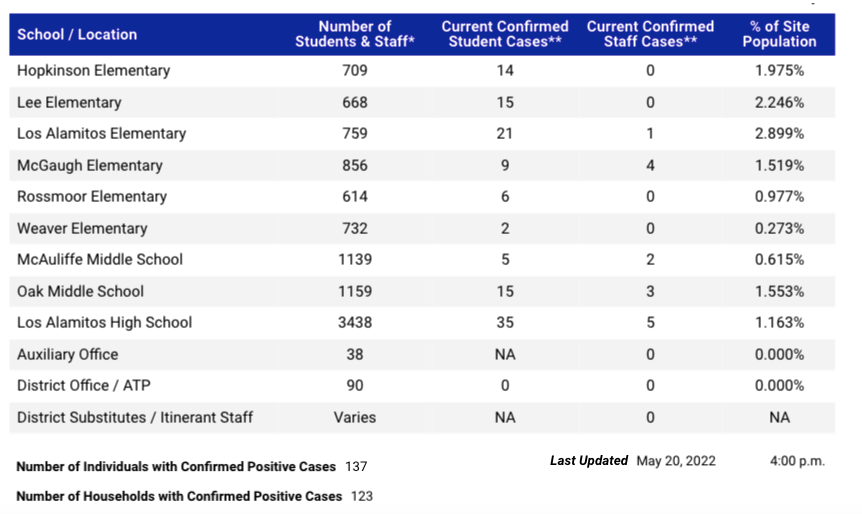 The latest update for the Los Alamitos Unified School District Covid-19 dashboard was from May 20. It showed 137 current reported infections among students and staff districtwide. You can find links to Covid-19 dashboards from other O.C. school districts at OC Covid Kids.