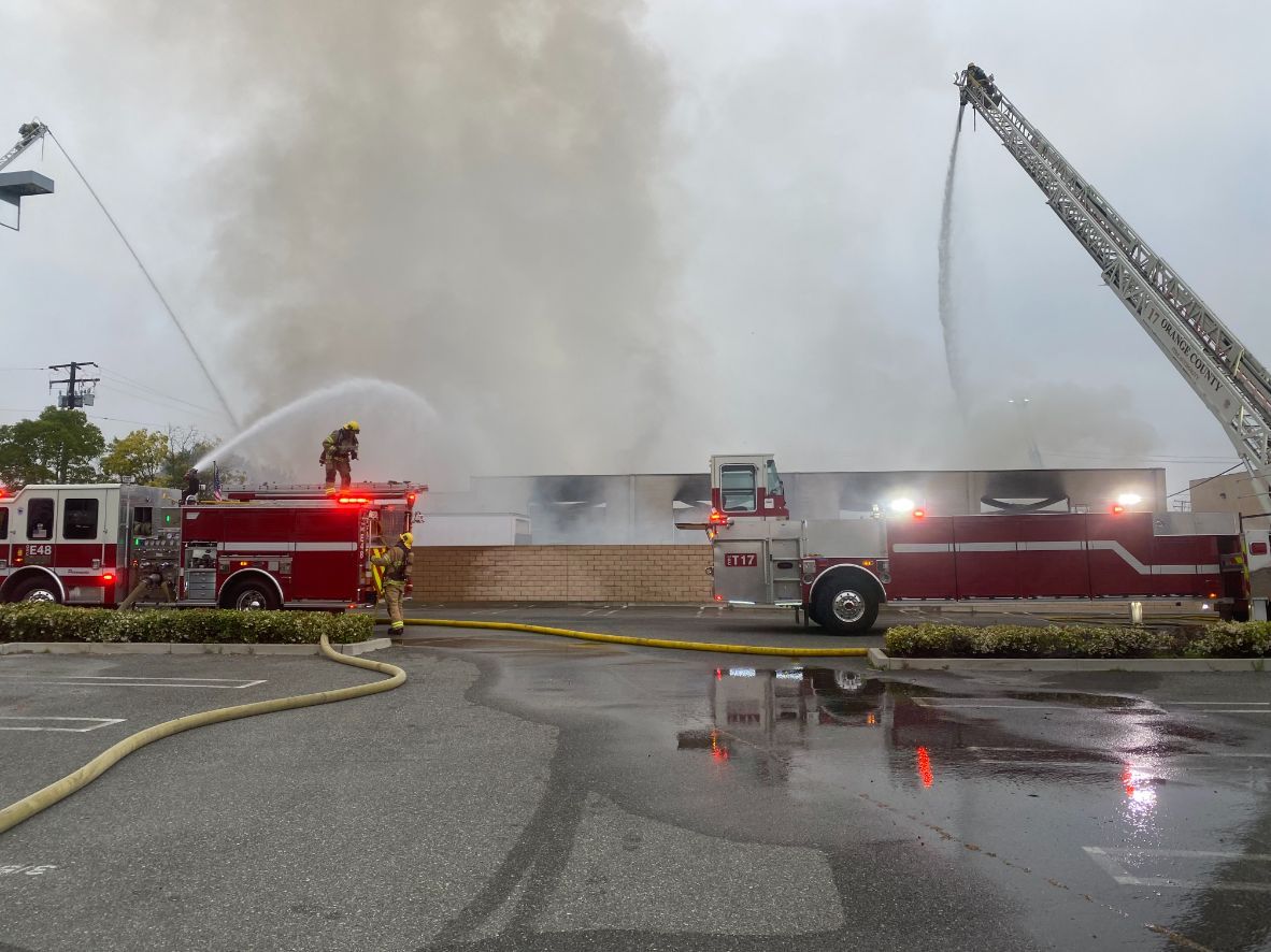 A live report at 6:15 a.m. on NCBLA showed the OCFA response with multiple fire trucks spraying at least three streams of water on the building as flames shot through its roof. A large plume of gray smoke billowed into the air.