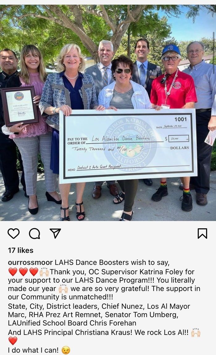 The Los Alamitos High School Dance Booster Club received its own boost recently. The group earned a $20,000 grant from the office of Orange County Supervisor Katrina Foley last week.