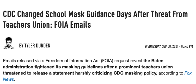 Another part of the site had a link claiming to show evidence that “California Teachers unions have threatened local school boards” over mask mandates. Clicking on it took you to a story that talks about the National Education Association’s emails to White House staff. The article’s author is listed as Tyler Durden with a thumbnail of Brad Pitt. Tyler Durden is the character Pitt played in the movie “Fight Club.”