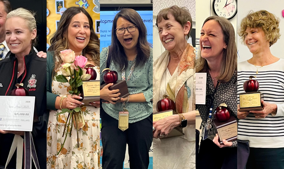 Each honoree was given a lofty apple-topped trophy and a goodie bag from sponsor SchoolsFirst Federal Credit Union. In November, the six educators will also be honored during a ceremony at the Disneyland Hotel where they will receive $25,000 from the Orange County Teachers of the Year Award Foundation. The five TK-12 teachers can now also compete to become a 2026 California Teacher of the Year.