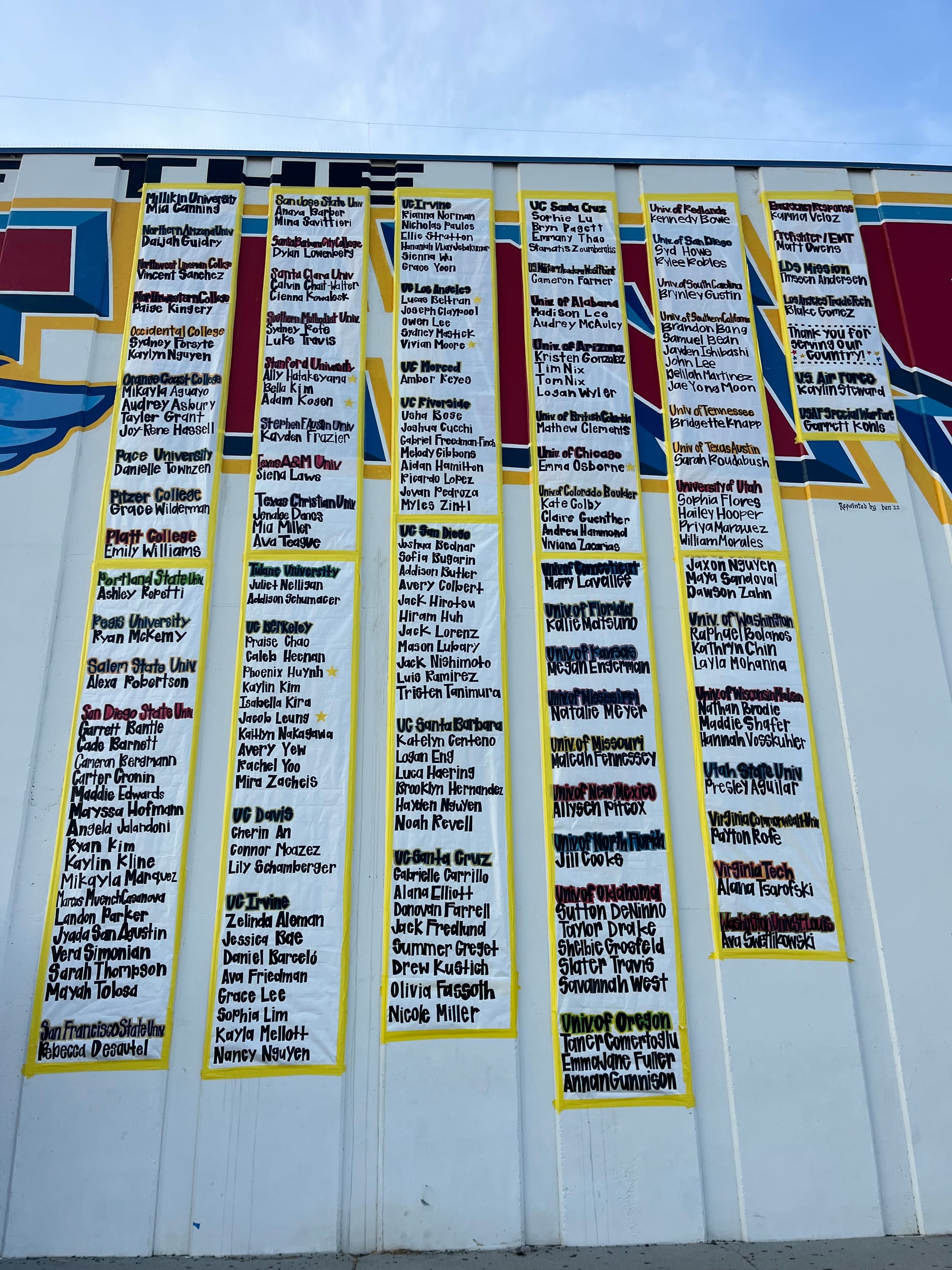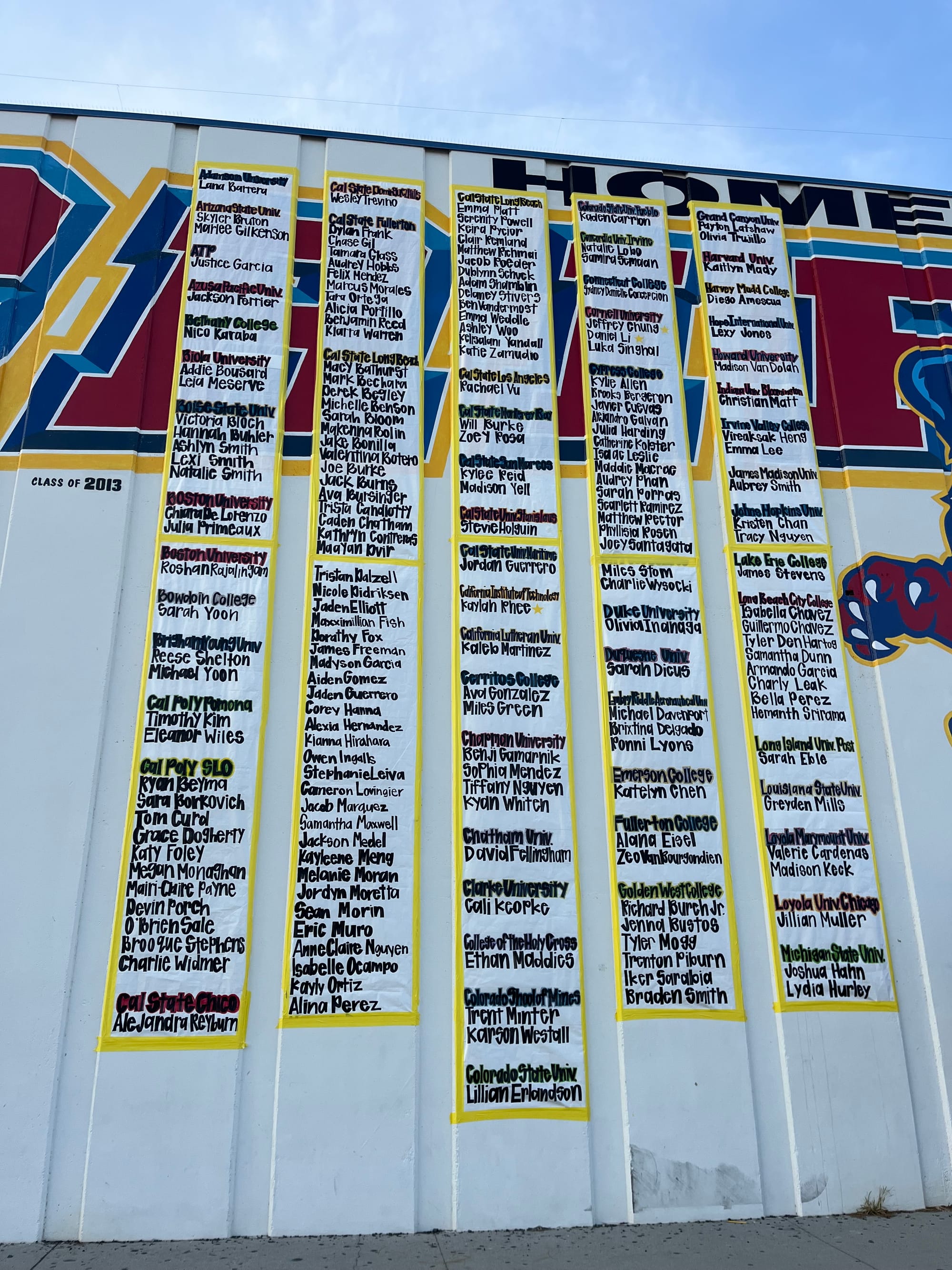 The exterior of the gymnasium at LAHS is also a window into students' next step in their educational journeys. The wall is plastered with posters listing where many of the more than 700 members of the class of 2025 are headed after graduation. More than 100 plan to attend a California State University and 70 will study at a University of California campus.