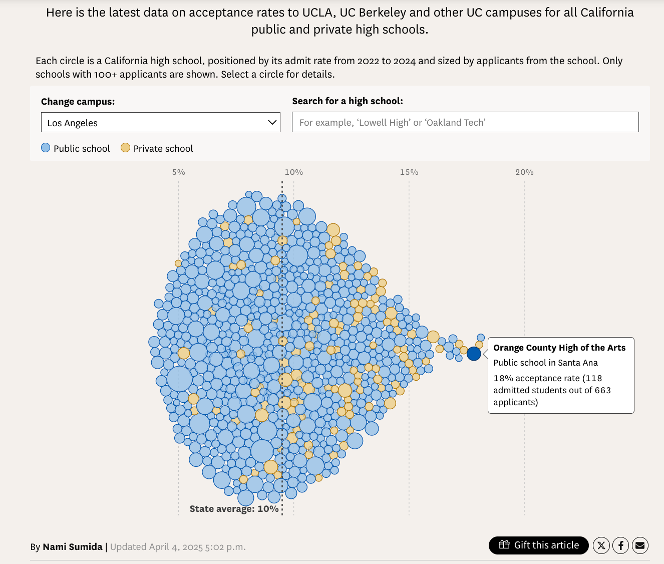 Another helpful resource comes from the San Francisco Chronicle, which offers an extensive interactive guide on public colleges and universities in California (Heads-up: There is a paywall to gain access.) Tools allow you to search for your high school's acceptance rate to all UC and CSU campuses. For the UCs, it covers all public and private high schools that had 100+ applicants to the nine campuses during the 2022-23 to 2024-25 school years. It is based on detailed admissions data published by the UC system.
