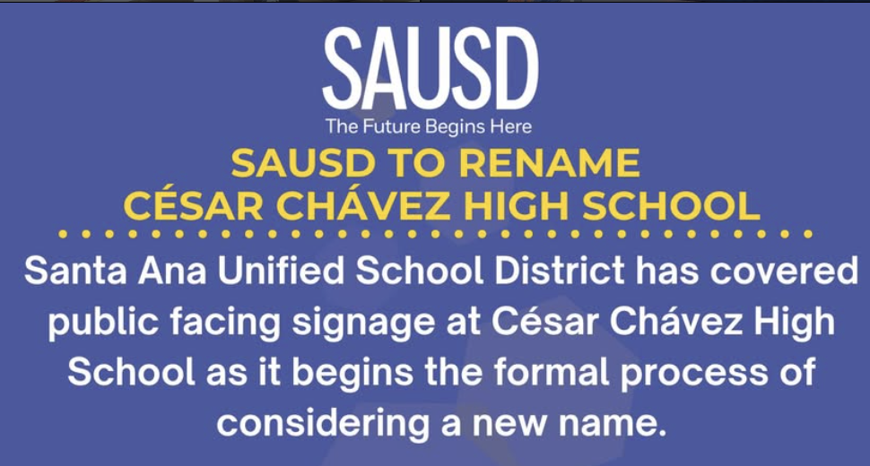 - In response, the Santa Ana Unified School District has started the process to rename César Chávez High School, the only public school in O.C. named after the United Farm Workers co-founder.