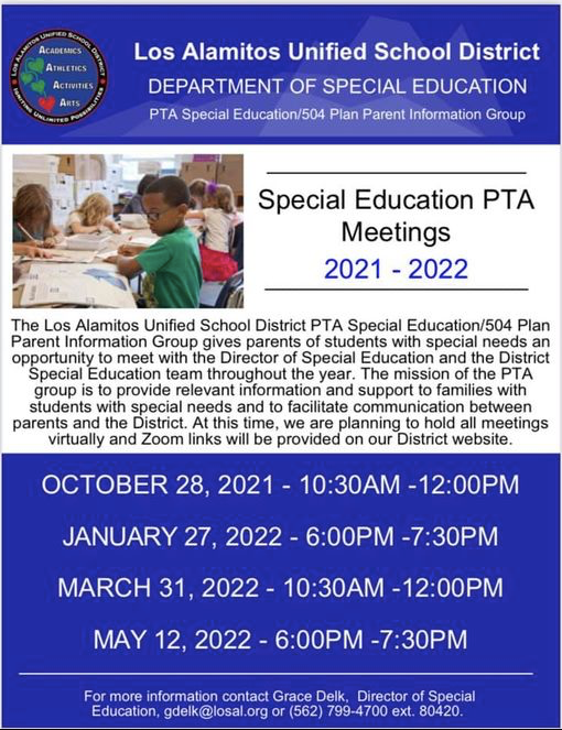 The Los Alamitos Unified School District PTA Special Education/504 Plan Parent Information Group is holding a series of virtual meetings to help you learn how to help your child with special needs. The first meeting is this week.