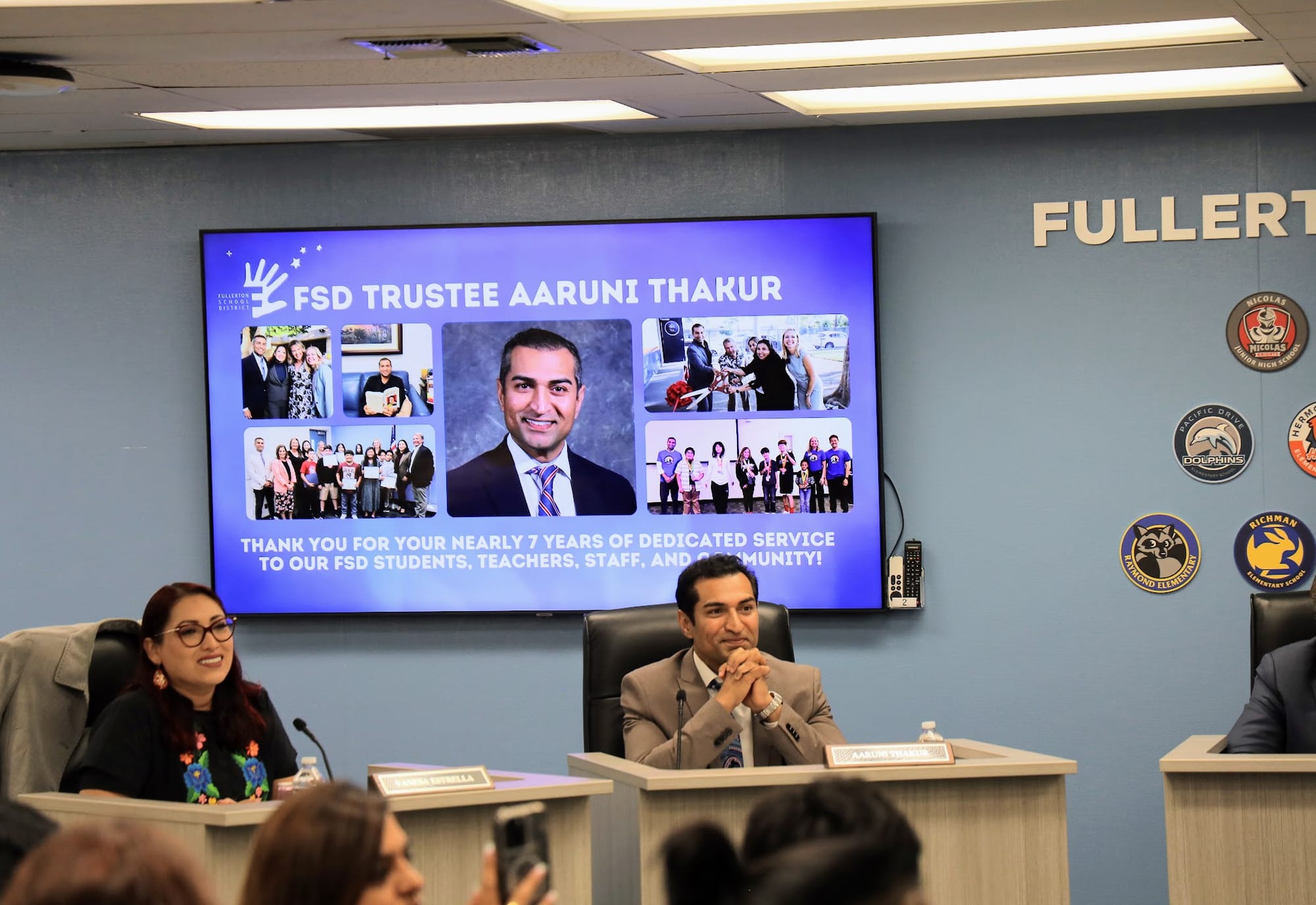 Thakur, an attorney, attended FSD schools, met his wife at Sunny Hills High School, and his children were students at FSD campuses. "I am, and always will be, a proud Fullertonian. While I will no longer be serving as a trustee, I am grateful that my family and I will continue to be active members of our Fullerton community," Thakur wrote in a letter to the community. The board publicly celebrated Thakur at its September 16 meeting.