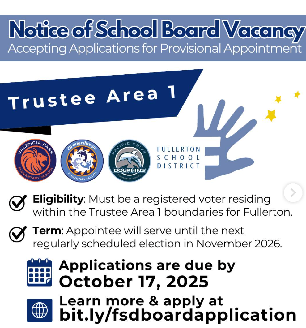 The board is now seeking to fill the seat to represent Trustee Area 1. Candidates must live in the Trustee 1 area which includes the FSD campuses of Valencia Park, Orangethorpe, and Pacific Drive Elementary Schools. Applications will be accepted until Oct. 17, at 5 p.m. Applicants are scheduled to be interviewed Wednesday, Oct. 29, at 5 p.m. in the Board Room. The temporary appointment would last until the Nov. 2026 election, when the position would be on the ballot. Find more information here.